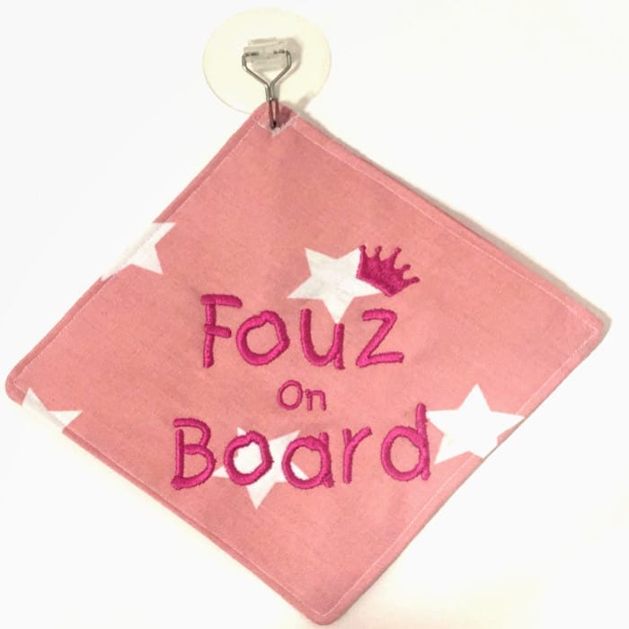 علامة طفل داخل السيارة على اسم الطفل ، مع خطاف لتعليقها على زجاج السيارة الخلفي .