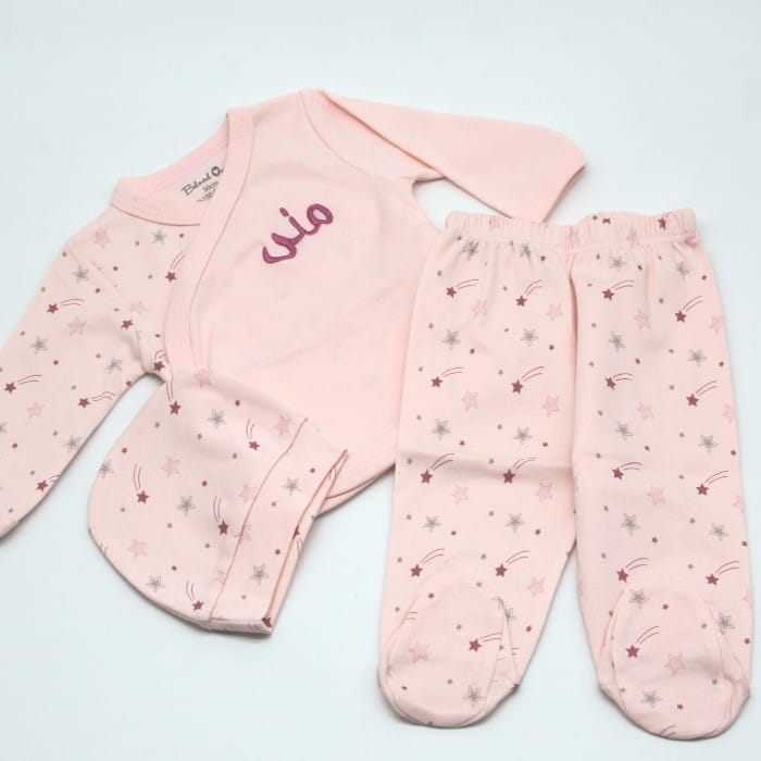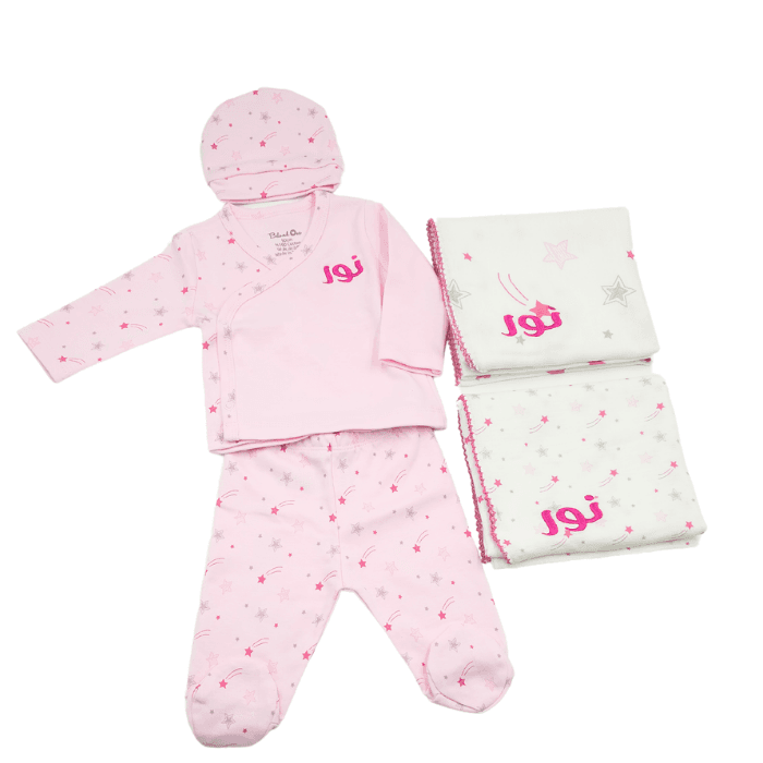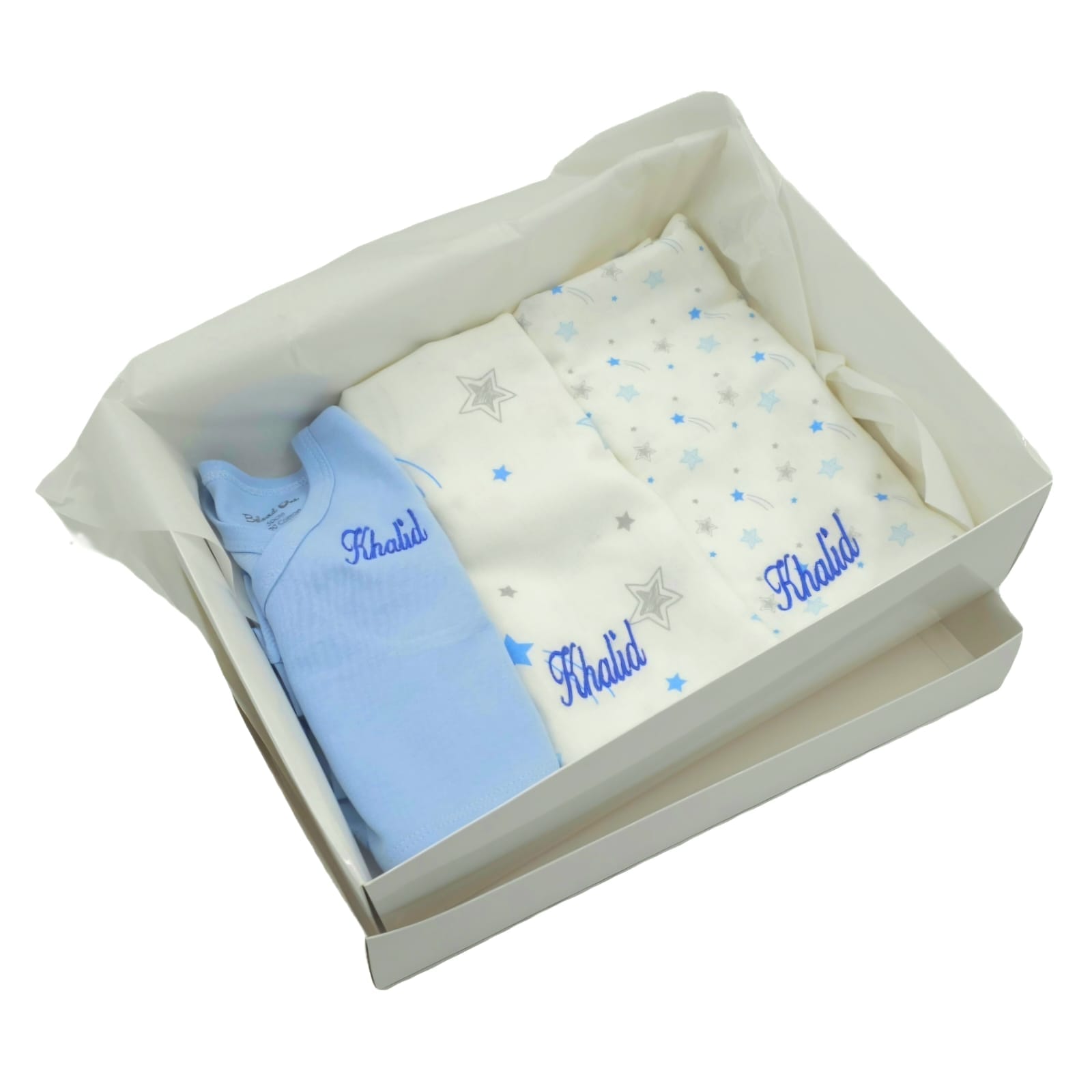 طقم مميز بالاسم لحديثي الولادة ، مكون من بيجامة مع عدد 2 من البطانيات الخفيفية المميزة ..