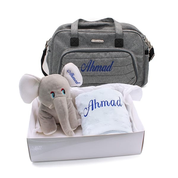 هدية مميزة مطرزة بإسم المولود عبارة عن حقيبة الطفل التي صممت بعناية لتناسب وتحتوي جميع أغراض الطفل التي تحتاجها الأم، تحتوي على عدة تقسيمات من الداخل بالاضافة لمساحة اضافية من الخارج و أماكن مخصصة من الجوانب بالاضافة الى البطانية الدافئة بالإسم مع لعبة الفيل.. صديق الأطفال .