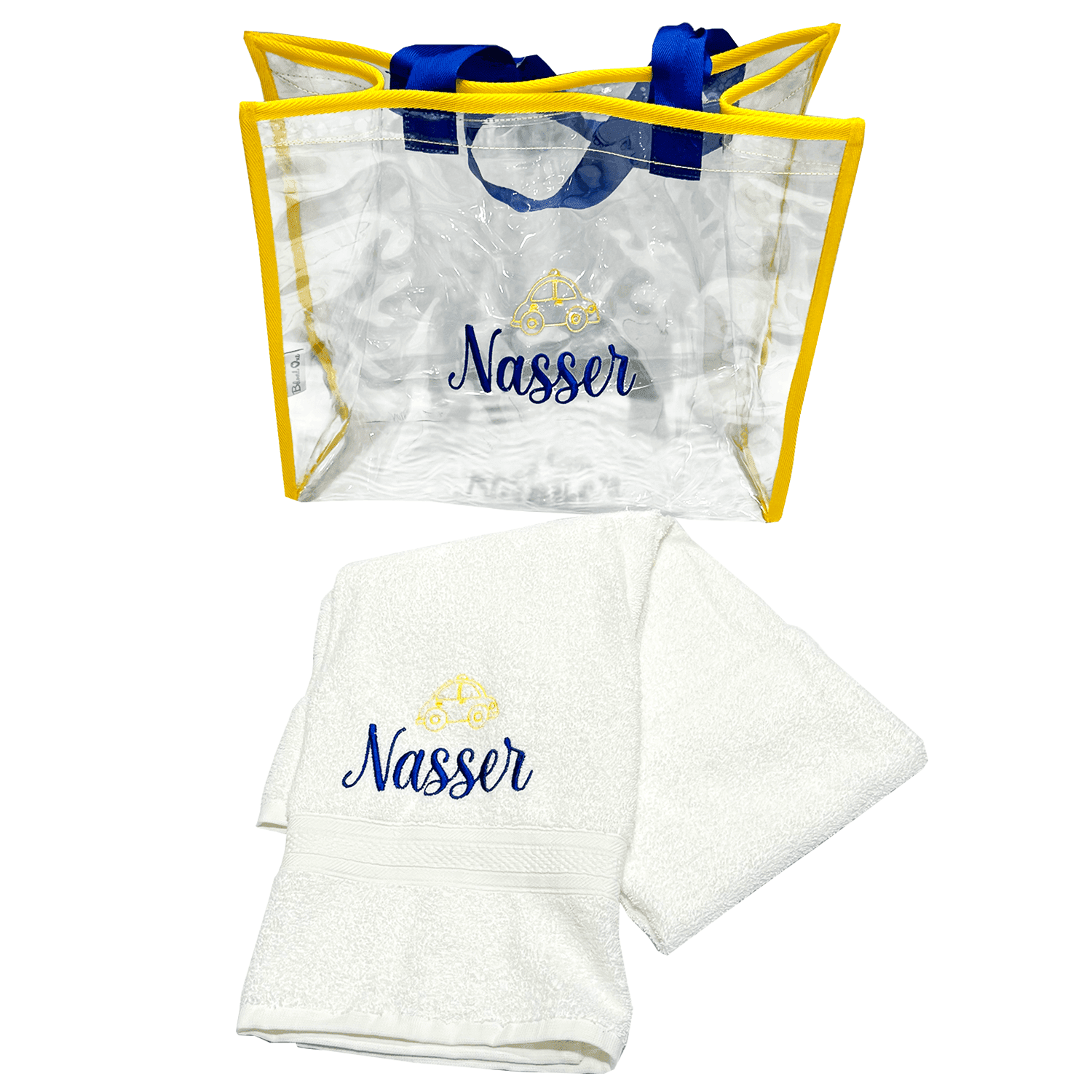 تشتمل هذه المجموعة على حقيبة شاطئ و منشفة بيضاء مخصصة مصنوعة من القطن بنسبة 100%.